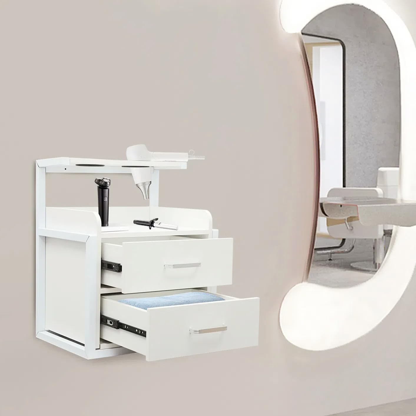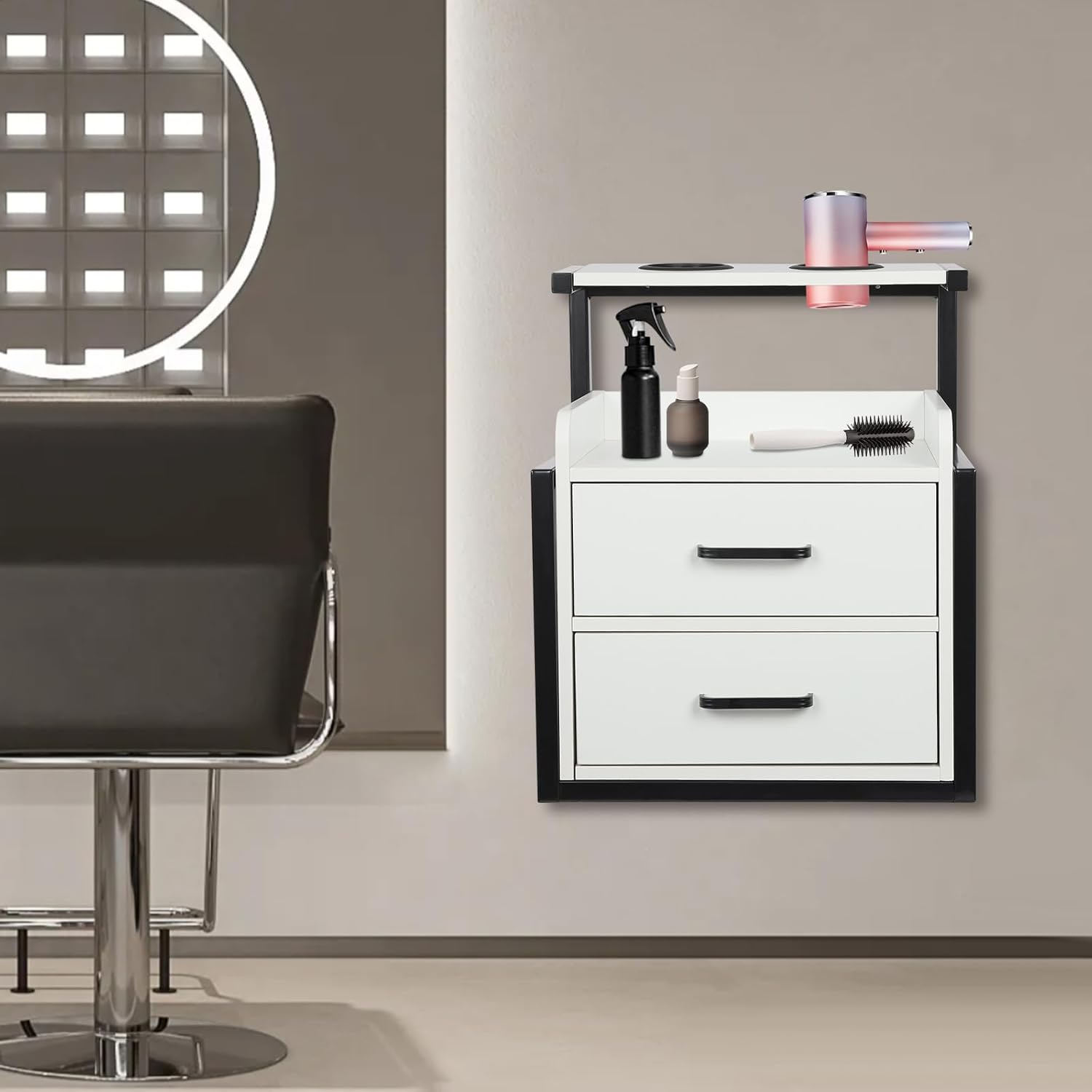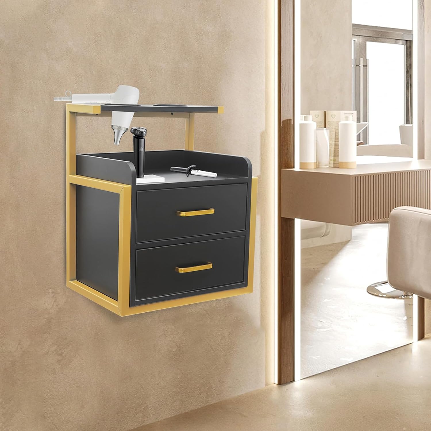 Description:If your storage cabinet is short on space, in poor shape, or your barber supplies are cluttered, then you may want to take a look at this salon wall cabinet from us. It boasts excellent durability, ample storage space, and a stylish outlook, which can solve the above problems and be a good helper for you. The simple structure and wall-mounted design make it space-saving and easy to clean.Details:Hair Dryer Holder: It provides you extra space for storing your hair dryers for convenient access.Heightened Edges: The open compartment above the drawers adopts heightened edges to prevent items from rolling off.Convenient Handles: These smooth and comfortable handles allow you to easily pull the drawers out for easier access to the items.Rounded Corners and Edges: The corners are rounded and smooth to reduce abrasions from collisions and improve safety.Application:This product can be used in spas, barber stores, salons, locker rooms, or bathrooms, and you can even place it in your bedroom to use as a bedside table. Specifications:Material: Density Board, Iron, Paint-free BoardColor:Silver+Black/Gold+White/Silver+White/Black/Black+Gold/Gold+Gray/Black+White/Gray+SilverStyle: Modern Shape: RectangularNumber of Drawers: 2Mount Type: Wall MountedLoad Bearing Capacity: 50kg/110.23lbsProduct Size: 40*30*48cm/15.75*11.81*18.9inPackage Size: 54*45*35cm/21.26*17.72*13.78inGross Weight: 10kg/22.05lbsNet Weight: 9kg/19.84lbsPackage Included:1* Salon Wall CabinetOther Accessories for InstallationNotes:1.Please carefully check if the size is suitable before placing an order.2.Barber tools shown in the picture are not included in this package.
